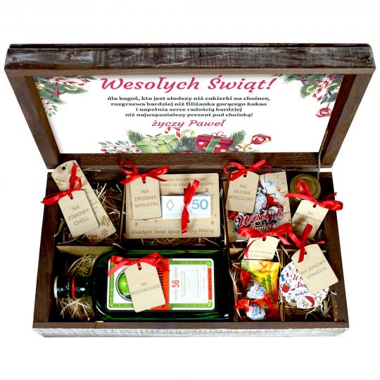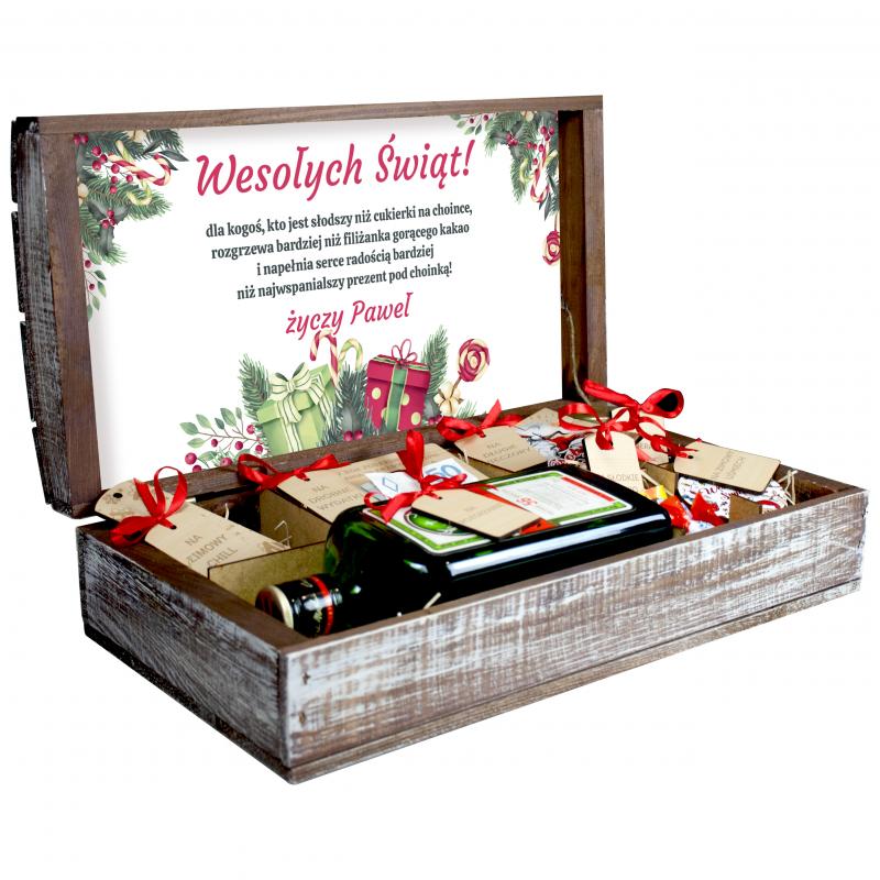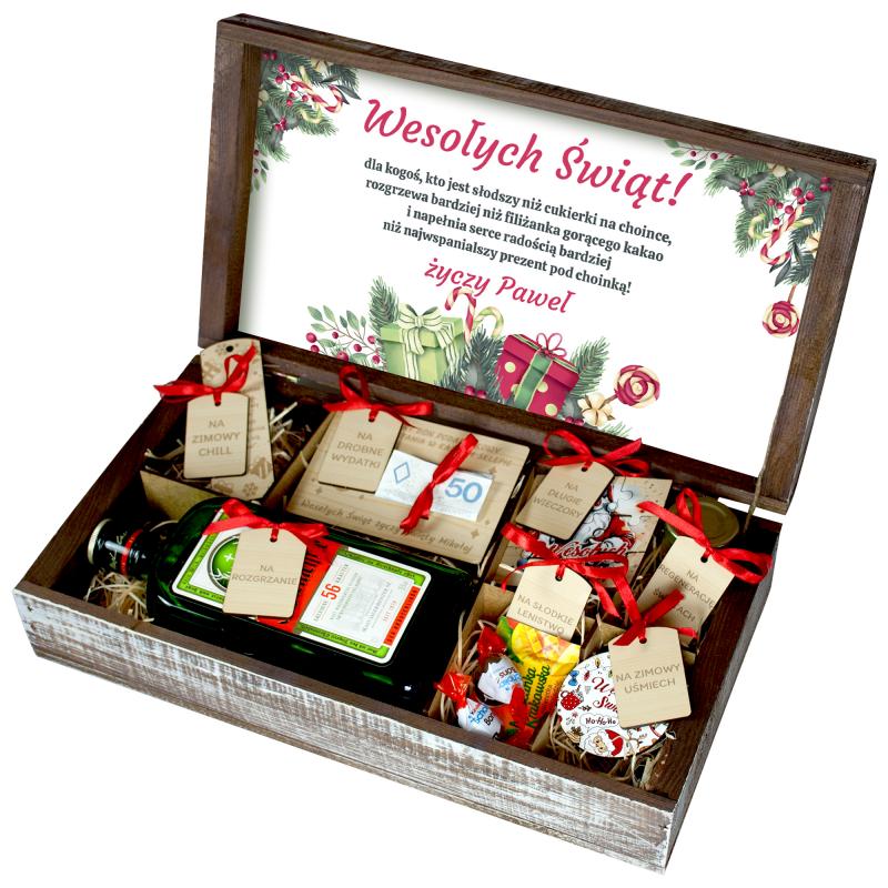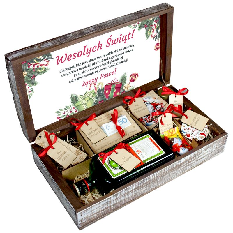 Niezbędnik świąteczny to wyjątkowy, personalizowany prezent, który pozwala obdarować bliską osobę zestawem drobiazgów dobranych z humorem, sercem i świątecznym klimatem. Wewnątrz znajduje się personalizowana karta z życzeniami – to Ty decydujesz, co ma się na niej znaleźć, dzięki czemu prezent staje się jeszcze bardziej osobisty. Całość pakowana jest w solidną, drewnianą skrzynkę, która sama w sobie stanowi piękną pamiątkę.