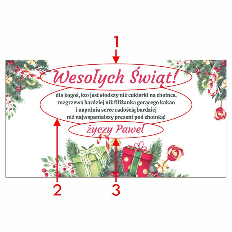 To pole przeznaczone na Twój tekst. Pamiętaj, aby tekst nie był za długi, ponieważ zmieni się układ tekstu, a to wpłynie na jego rozmiar. Jeśli chcesz, aby to miejsce było puste, zaznacz "Nie chcę personalizować tego pola (brak tekstu)".