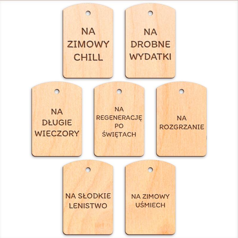Niezbędnik pozwala przygotować indywidualny zestaw małych radości – idealny dla partnera, przyjaciółki, rodzica czy dziadka. W środku znajdują się zawieszki tematyczne, które możesz dopasować do wybranych drobiazgów, tworząc prezent pełen uśmiechu i zaskoczenia. Zdjęcie przedstawia propozycję rozmieszczenia zawieszek oraz przykładowe gadżety, które można dokupić w zakładce Niezbędne akcesoria.
