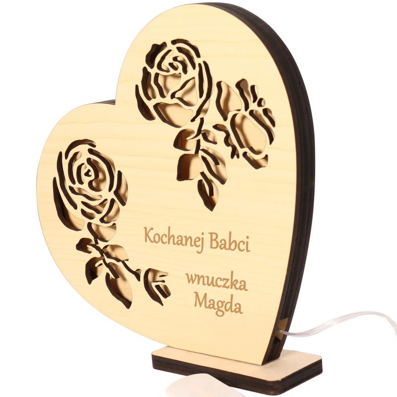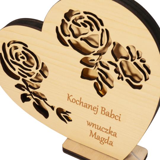 Drewniana lampa w kształcie serca dla Babci podświetlana statuetka z grawerem na Dzień Babci i Dziadka