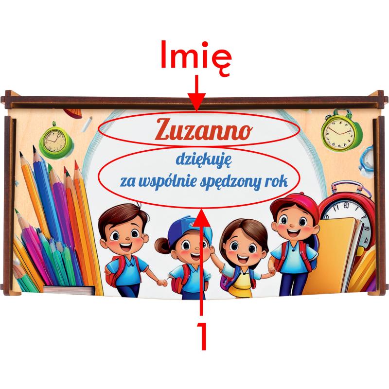 Prosimy wpisać tutaj dokładny tekst, jaki ma zostać umieszczony w tym miejscu. Ten upominek to dobry pomysł na prezent dla ucznia. Jeżeli zamawiasz więcej niż jeden i chcesz, aby na każdym było inne imię, wpisz w tym polu te imiona, rozdzielając przecinkiem. Jeśli imię będzie bardzo długie, zostanie pomniejszone tak, aby zmieściło się w docelowym polu. Jeśli chcesz, aby to miejsce było puste, zaznacz "Nie chcę personalizować tego pola (brak tekstu)".