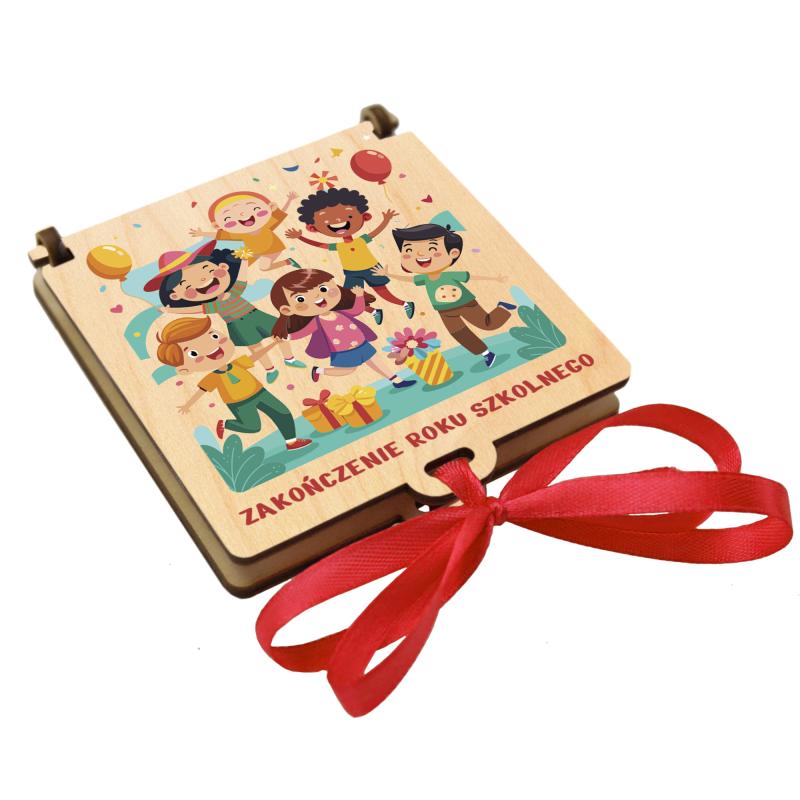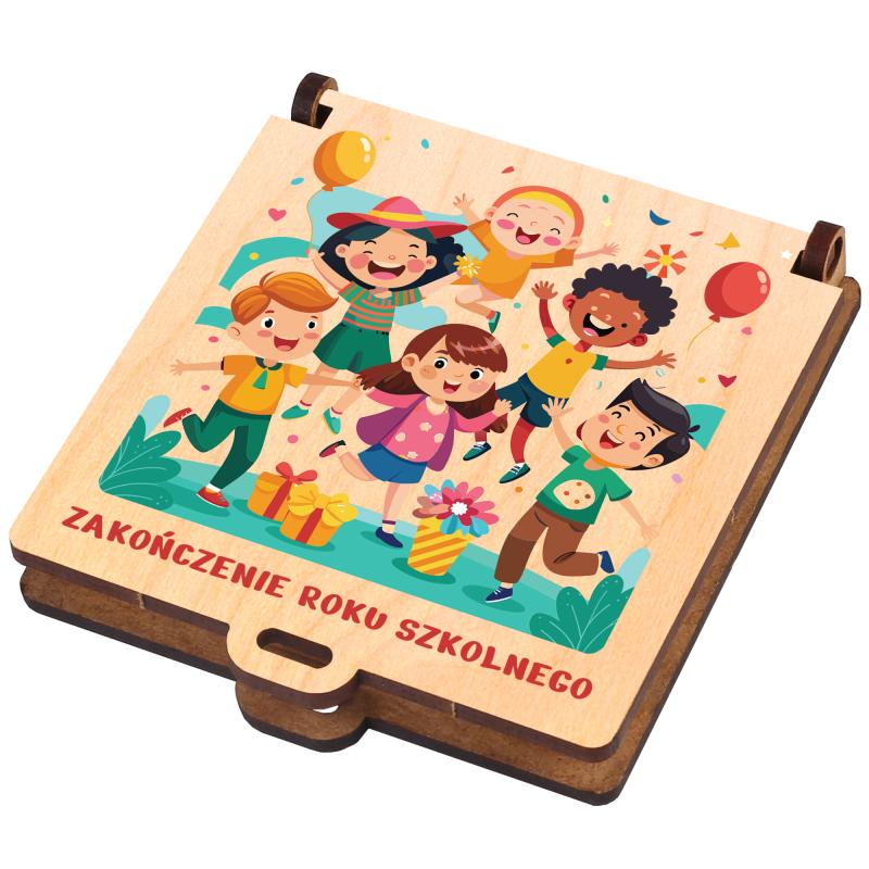 Zamykana, kompaktowa forma sprawia, że gra idealnie sprawdzi się zarówno w domu, jak i w podróży. Kolorowy nadruk z radosnymi dziećmi oraz napis „Zakończenie roku szkolnego” dodaje jej wyjątkowego charakteru, a naturalne drewno gwarantuje trwałość i bezpieczeństwo w użytkowaniu.