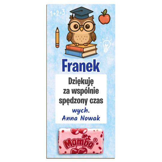 Kolorowy, personalizowany upominek z gumą Mamba to świetny sposób, by w prosty i słodki sposób podziękować dzieciom za wspólnie spędzony czas. Nadruk z imieniem dziecka i podpisem wychowawcy nadaje prezentowi wyjątkowego charakteru. Idealny na zakończenie roku szkolnego, przedszkolnego lub kolonii.