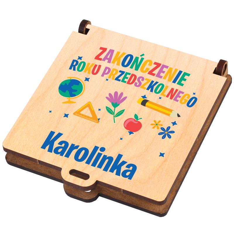 Wykonana z naturalnego drewna gra posiada kolorowy nadruk oraz imię dziecka, dzięki czemu staje się unikalnym prezentem dopasowanym do konkretnej osoby. Motywy szkolne i przedszkolne nadają jej radosny i dziecięcy charakter.