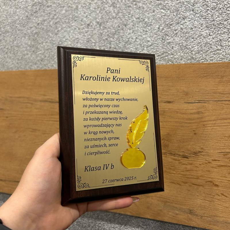 Wykonana z wysokiej jakości materiałów i starannie wykończona, prezentuje się niezwykle elegancko i solidnie. To produkt dopracowany w każdym szczególe – idealny do postawienia na biurku lub powieszenia na ścianie. Personalizacja pozwala dodać nazwisko nauczyciela, podpis klasy oraz datę, dzięki czemu podziękowanie nabiera osobistego charakteru.