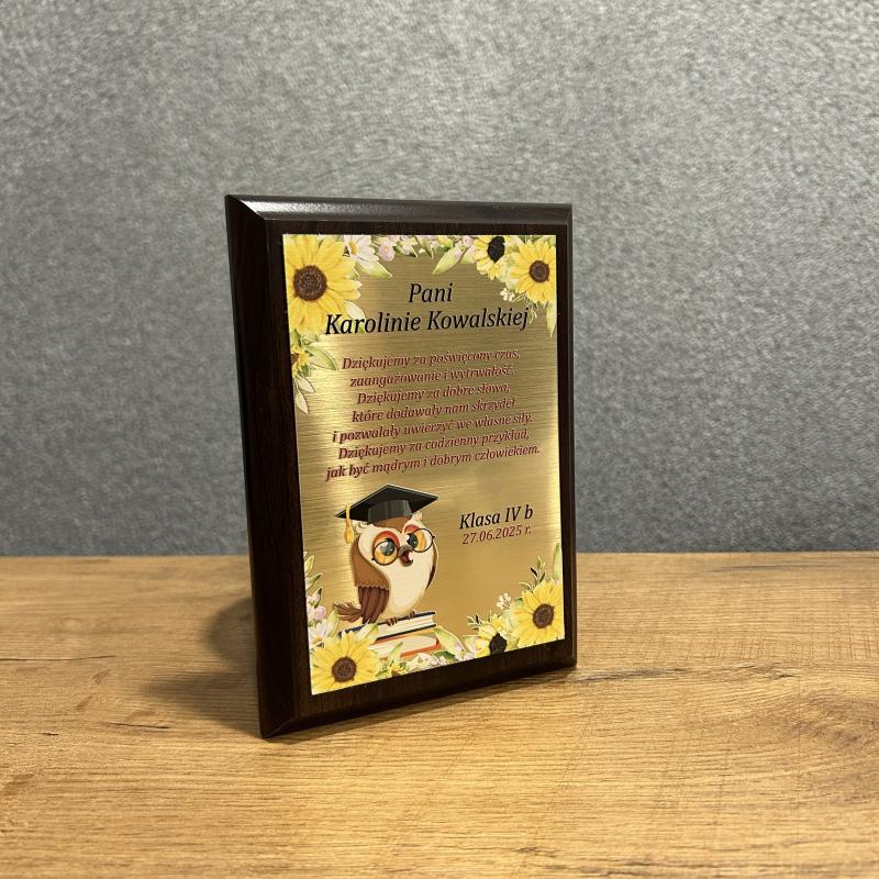 Wykonana z drewna z metalizowaną, złotą płytką, zawiera spersonalizowaną dedykację, imię nauczyciela, klasę i datę. Ozdobiona grafiką sowy w birecie, która symbolizuje mądrość i edukację, będzie piękną pamiątką i wyrazem uznania od uczniów.