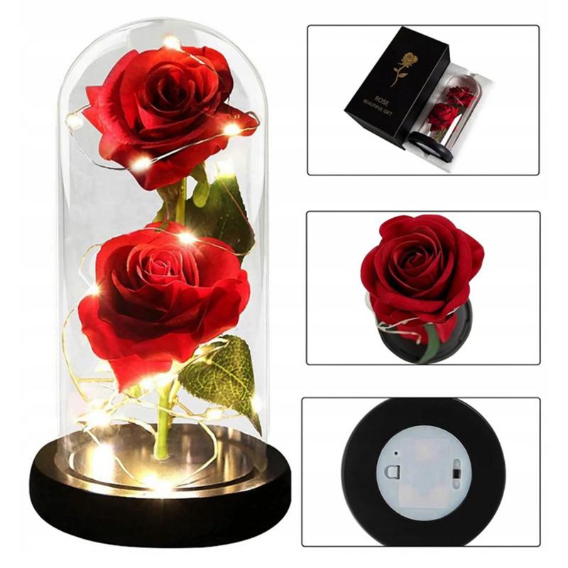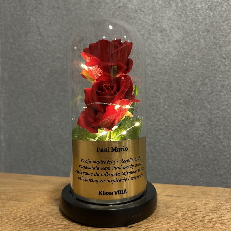 Elegancka dekoracja z różami i oświetleniem LED to niezwykle romantyczny i pełen uroku prezent na Zakończenie Roku Szkolnego lub Dzień Nauczyciela. Szklana kopuła, w której umieszczono piękne róże, subtelnie podświetlone delikatnym światłem, tworzy wyjątkowy klimat.
