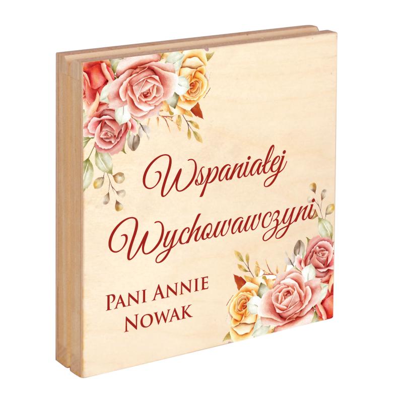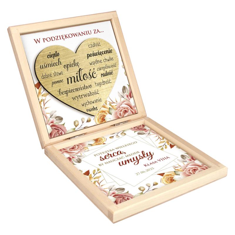 Wyjątkowy prezent pełen wdzięczności – eleganckie drewniane pudełko z personalizacją i sercem z grawerem to wzruszająca forma podziękowania dla wychowawcy. Bogato zdobione wnętrze oraz ciepłe słowa sprawiają, że to nie tylko upominek, ale trwała pamiątka wyjątkowej relacji.