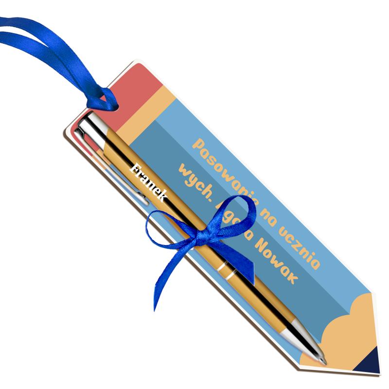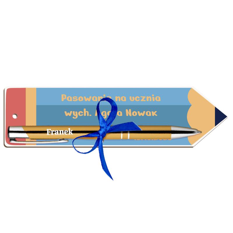 Zakładka z długopisem i imieniem ucznia na pasowanie