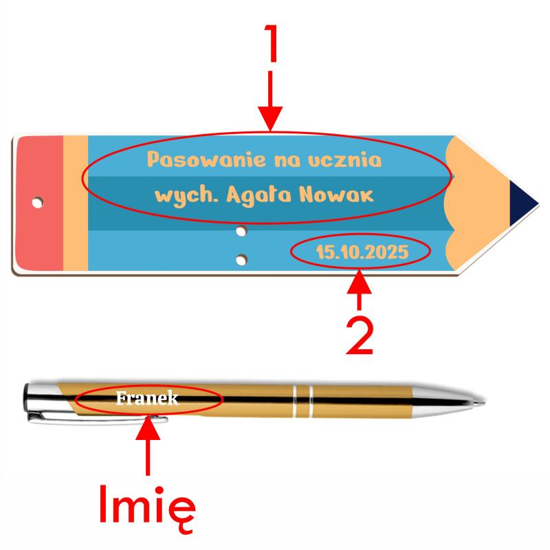 Praktyczny i symboliczny upominek z okazji pasowania na ucznia! Kolorowa zakładka w kształcie ołówka z dołączonym eleganckim długopisem, na którym wygrawerujemy imię ucznia. Całość prezentuje się estetycznie i szkolnie – idealna pamiątka z wyjątkowego dnia.