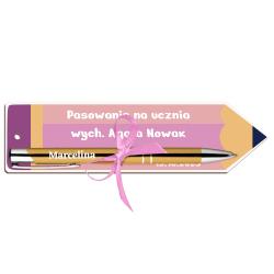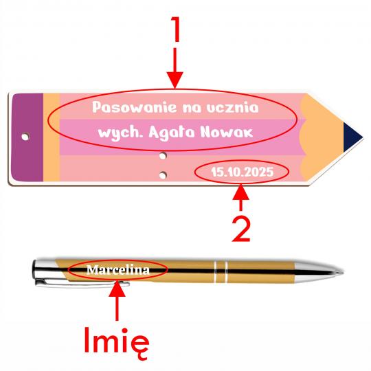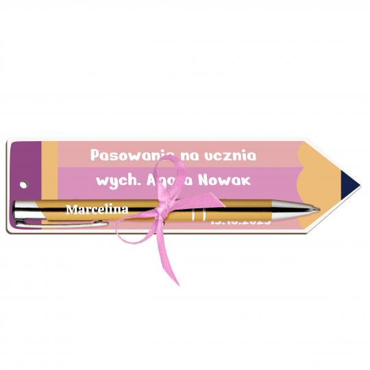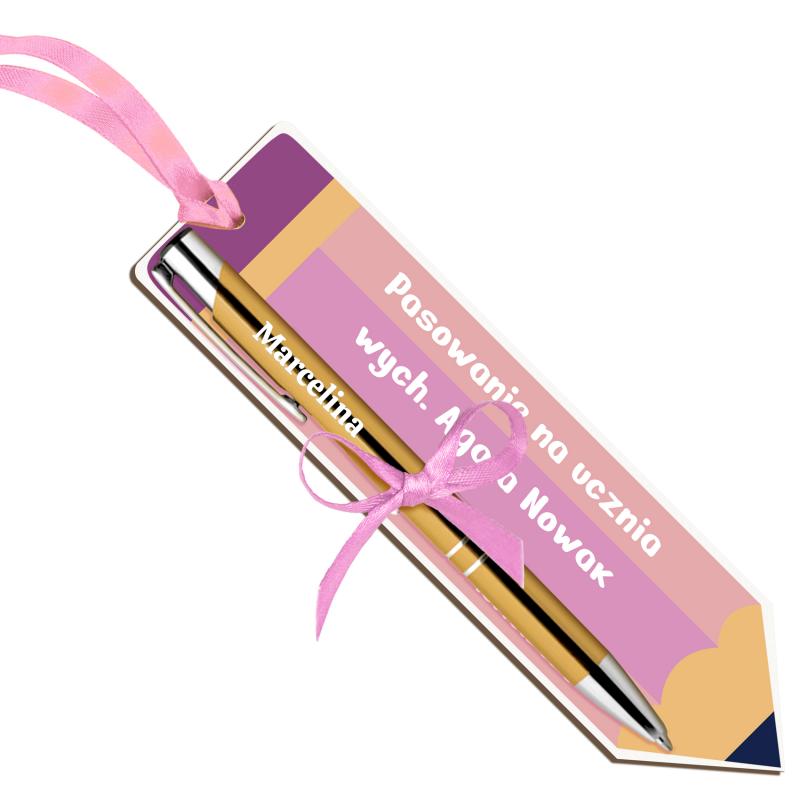 Zakładka z długopisem i imieniem ucznia na pasowanie
