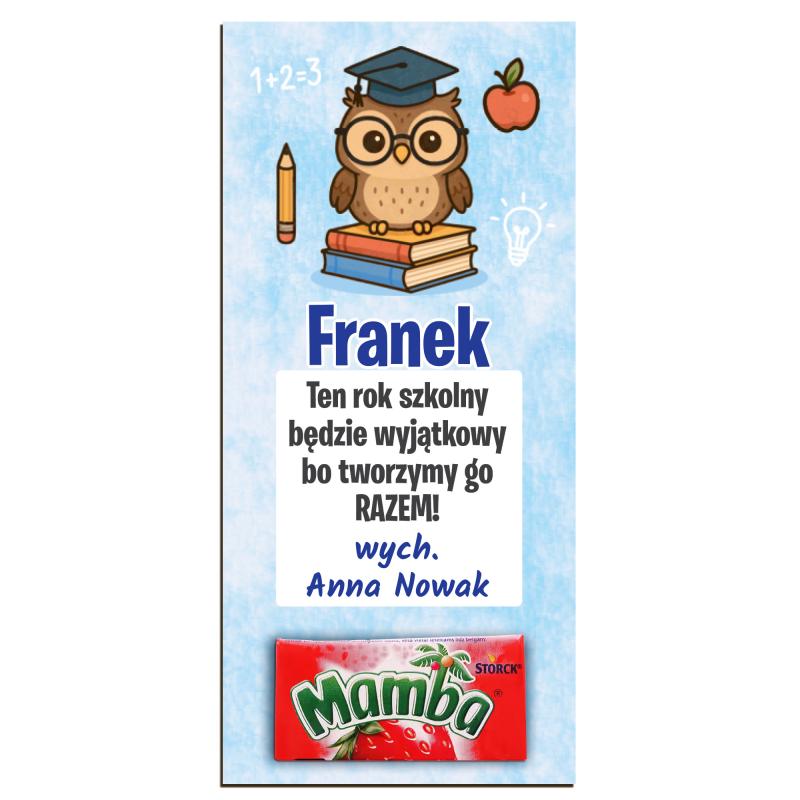 Słodki i motywujący upominek z okazji pasowania na ucznia! Kolorowa zakładka do książki z nadrukiem sowy i pozytywnym przesłaniem od wychowawcy, imieniem ucznia oraz dołączonym cukierkiem Mamba to radość i zachęta do nauki w jednym.