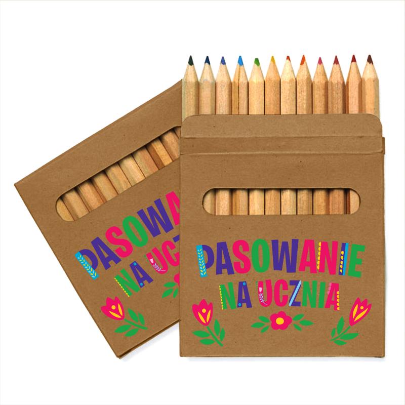Zestaw kolorowych kredek w ekologicznym pudełku z napisem Pasowanie na ucznia. Świetny upominek dla pierwszoklasisty na szkolną uroczystość.