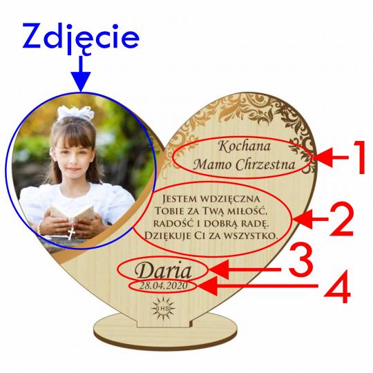 Statuetka ze zdjęciem to piękny i osobisty sposób na podziękowanie dla rodziców chrzestnych z okazji pierwszej Komunii Świętej dziecka. Wykonana jest z trwałego materiału, a na jej powierzchni umieszczona zostaje indywidualna fotografia dziecka wraz z datą i dedykacją. Statuetka ma kształt serca i ma wymiary 15x12 cm, co czyni ją idealnym dodatkiem do wystawy w domu czy biurze rodziców chrzestnych. To niezwykła pamiątka, która zachowa piękne wspomnienia z tego wyjątkowego dnia na wiele lat.