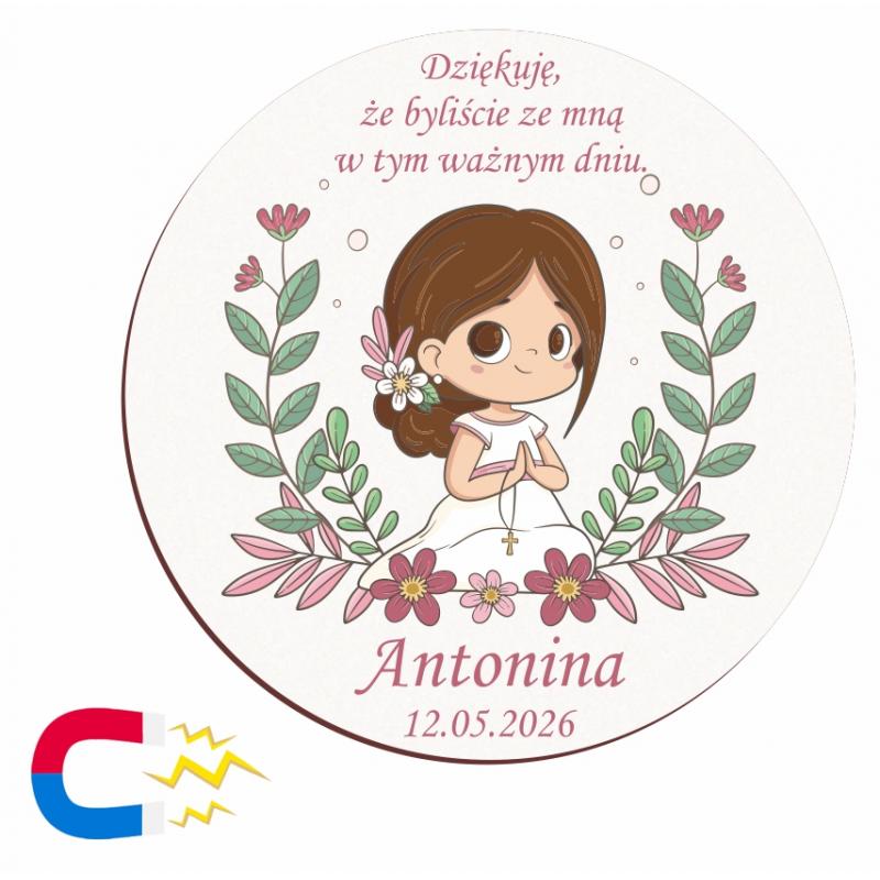 Okrągłe podziękowanie magnes na I Komunię Świętą dla dziewczynki