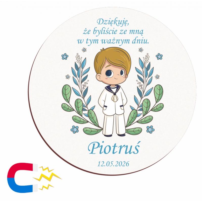 Magnes przedstawia ilustrację chłopca komunijnego oraz napis z podziękowaniem, imieniem dziecka i datą uroczystości.