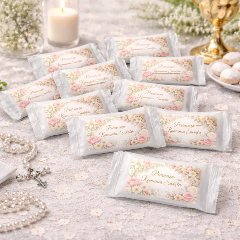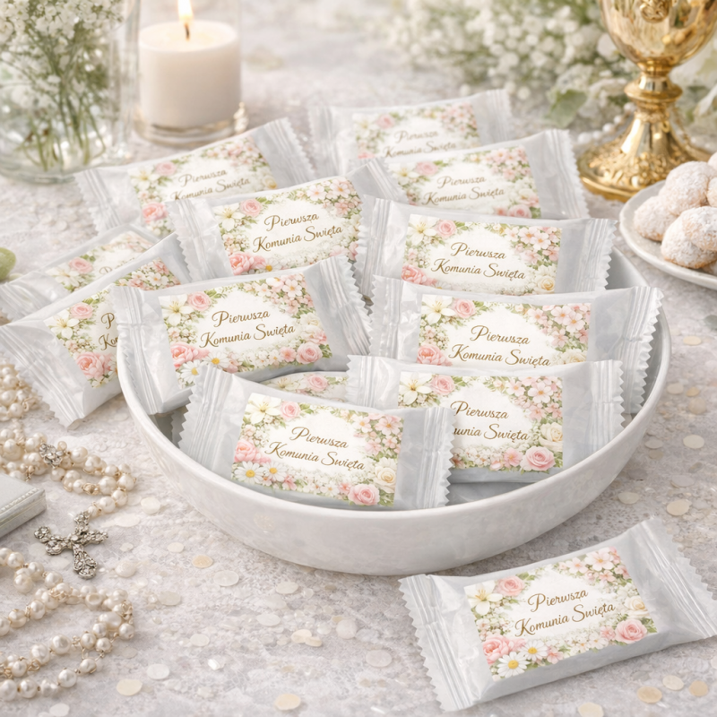 Podkreśl wyjątkowy charakter przyjęcia komunijnego dzięki naszym aromatycznym ciastkom korzennym. Te chrupiące herbatniki, zapakowane w estetyczne, higieniczne saszetki, to doskonały dodatek do filiżanki kawy lub herbaty serwowanej podczas uroczystego obiadu. Każde ciastko znajduje się w dedykowanym opakowaniu z motywem różowych i białych lilii. To nie tylko pyszny poczęstunek, ale także element dekoracyjny, który dopełnia oprawę wizualną stołu.