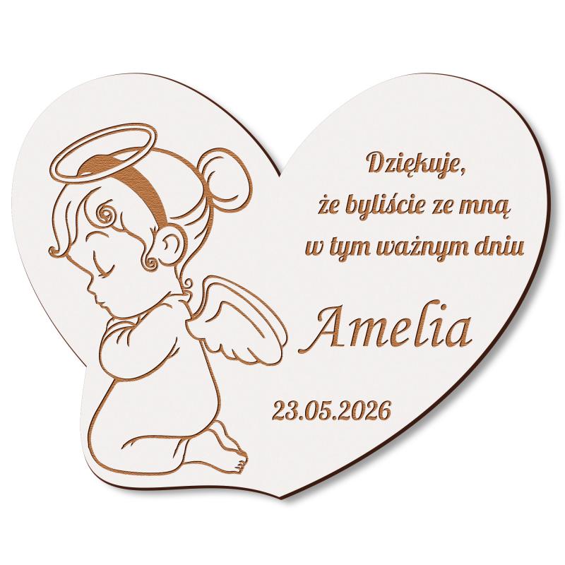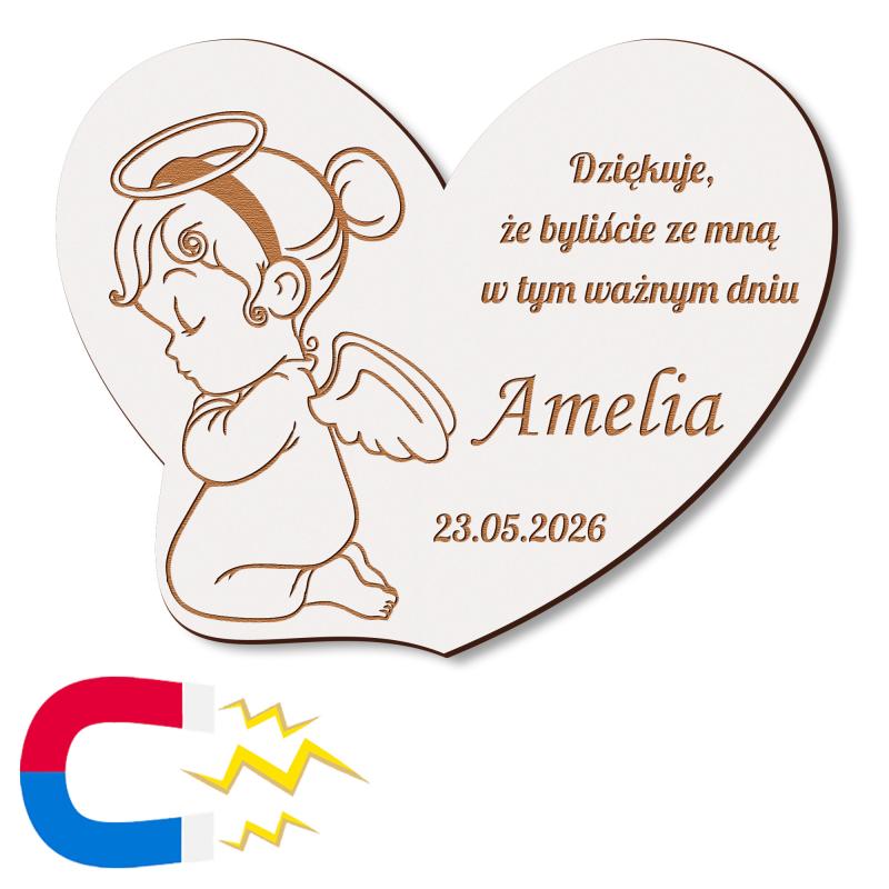 Elegancki magnes z grawerem na Komunię w kształcie serca to wyjątkowe podziękowanie dla gości, które łączy estetykę i trwałą pamiątkę tego ważnego dnia. Motyw aniołka podkreśla religijny charakter uroczystości.