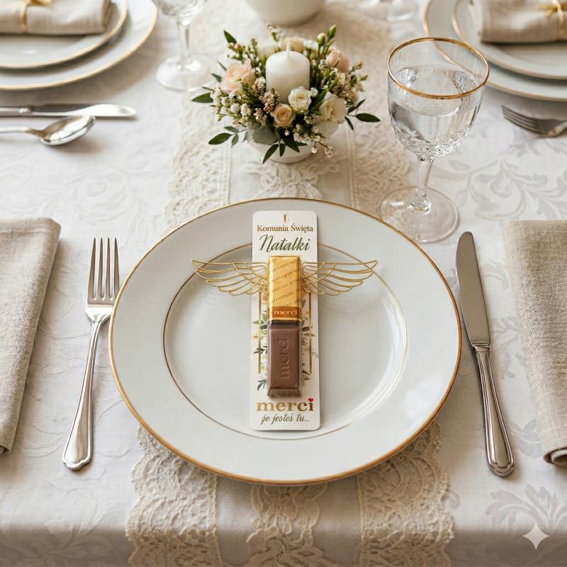Eleganckie podziękowanie dla gości na Komunię w formie dekoracyjnej tabliczki ze skrzydełkami to wyjątkowy i stylowy upominek, który pięknie podkreśla charakter uroczystości Pierwszej Komunii Świętej. Delikatna grafika oraz złote detale nadają całości subtelny i uroczysty wygląd.