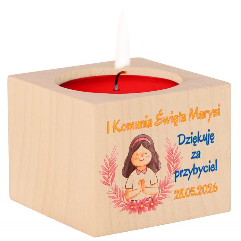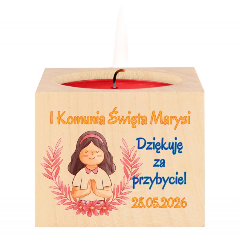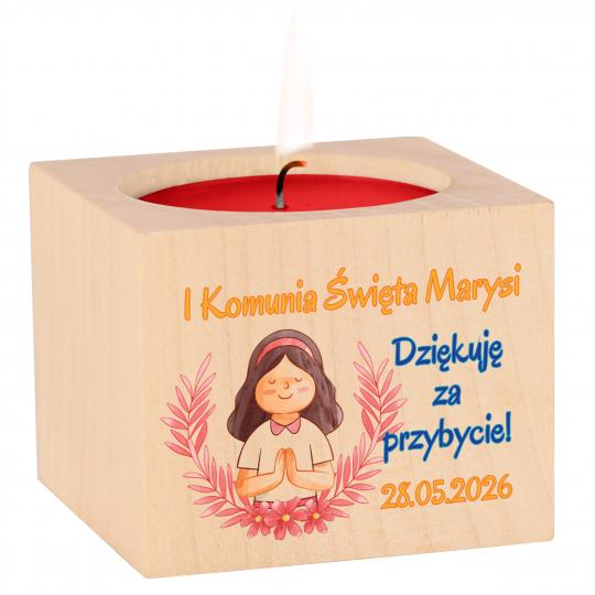 Drewniany świecznik na I Komunię Świętą dziewczynki to elegancki i symboliczny upominek dla gości. Personalizowany nadruk z imieniem oraz datą uroczystości tworzy wyjątkową pamiątkę tego dnia.