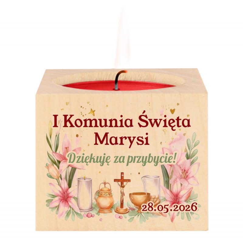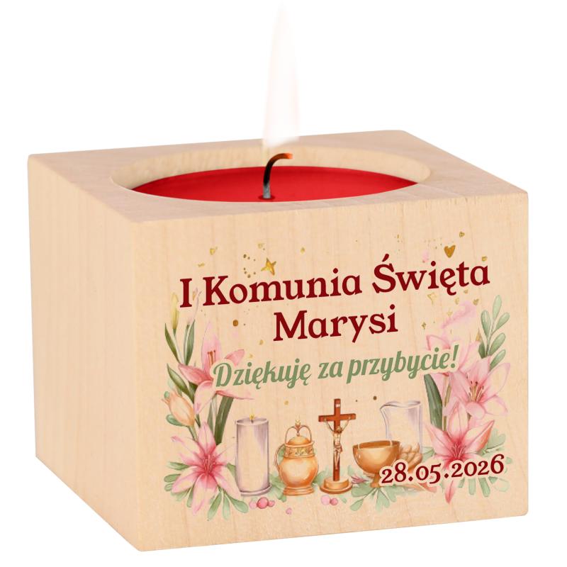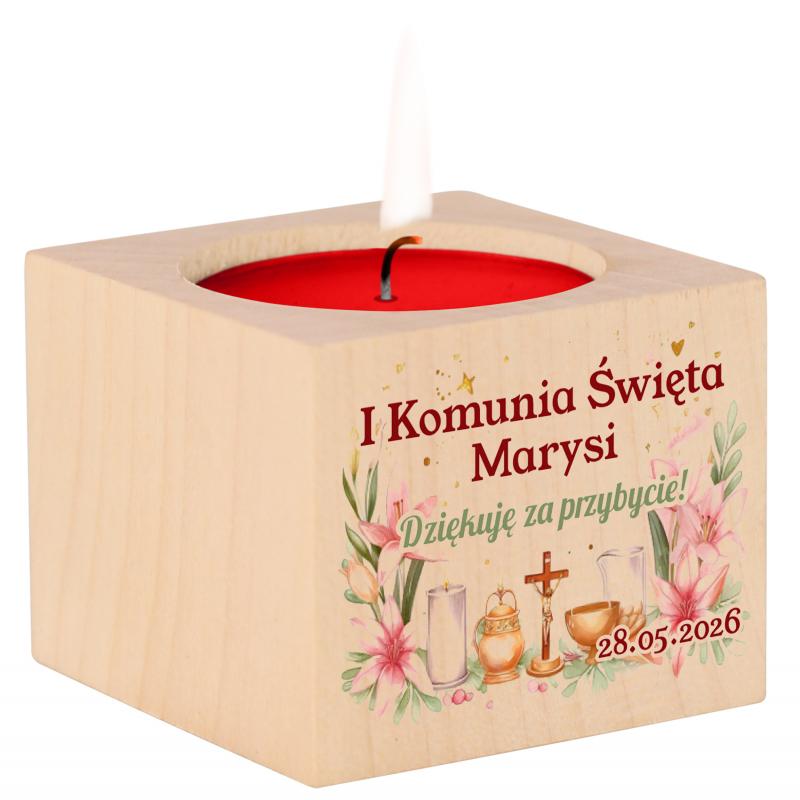 Drewniany świecznik na I Komunię Świętą to elegancki i symboliczny upominek dla gości, który podkreśli wyjątkowy charakter uroczystości. Personalizowany nadruk z imieniem oraz datą sprawia, że staje się piękną pamiątką na lata.