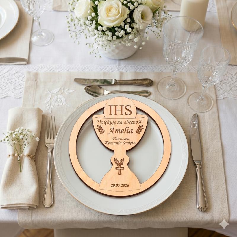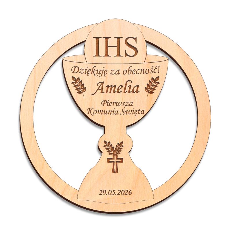 Drewniane podziękowanie dla gości z grawerem to elegancki i symboliczny upominek, który w wyjątkowy sposób wyrazi wdzięczność za obecność podczas Pierwszej Komunii Świętej. Motyw kielicha z symbolem IHS oraz precyzyjny grawer z imieniem i datą nadają całości uroczysty charakter.