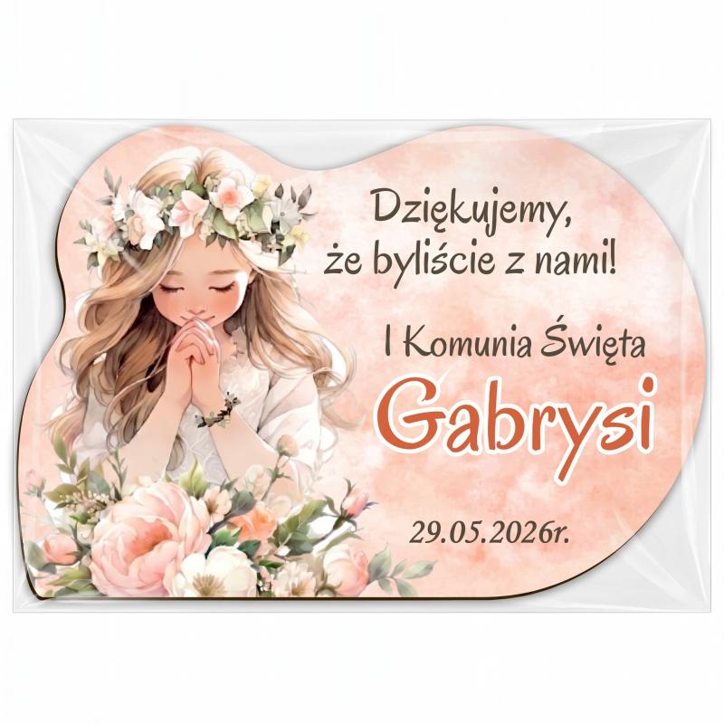 Magnes komunijny w folii ochronnej to eleganckie podziękowanie dla gości, które wyróżnia się subtelną, dziewczęcą grafiką i delikatną kolorystyką. Personalizacja imieniem i datą nadaje mu wyjątkowy, indywidualny charakter.