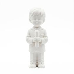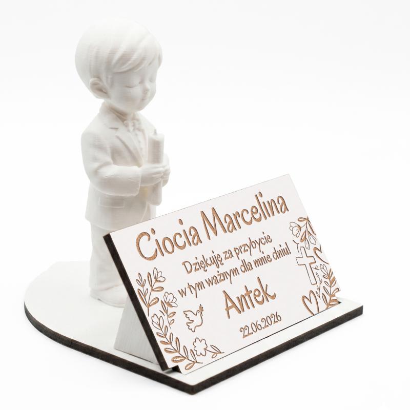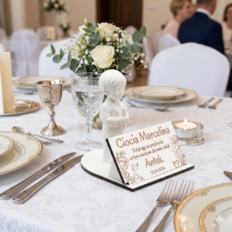 Subtelna figurka chłopca w komunijnym stroju pięknie podkreśla religijny charakter wydarzenia i doskonale komponuje się z dekoracją stołu.