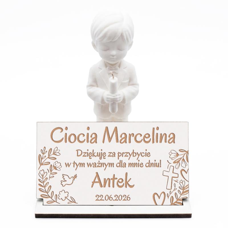 Elegancka winietka z chłopcem to wyjątkowe podziękowanie dla gości na Pierwszą Komunię Świętą. Personalizowany grawer z imieniem gościa oraz dedykacją nadaje jej indywidualny i uroczysty charakter.