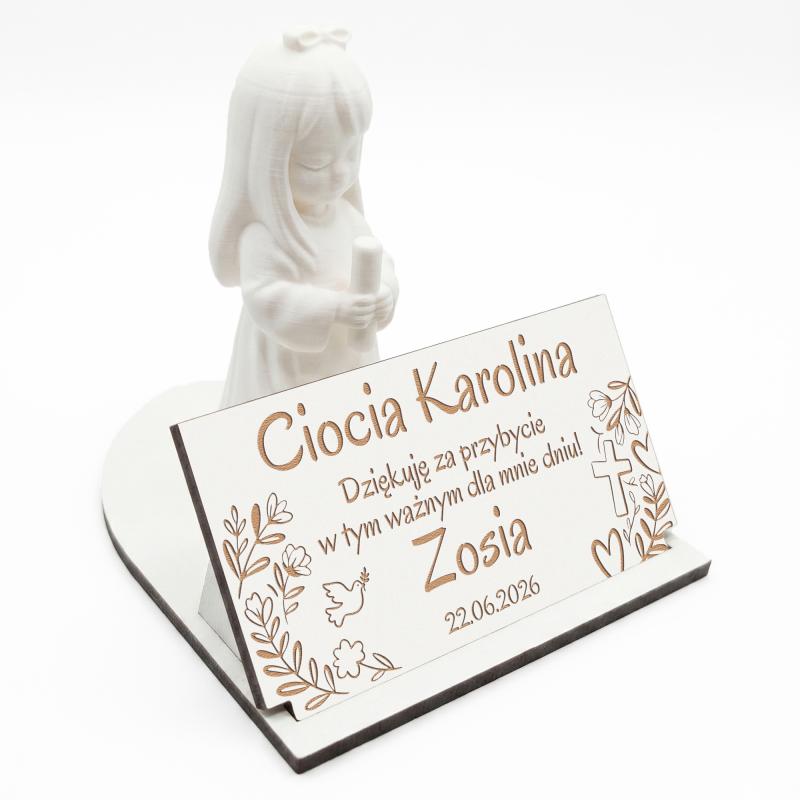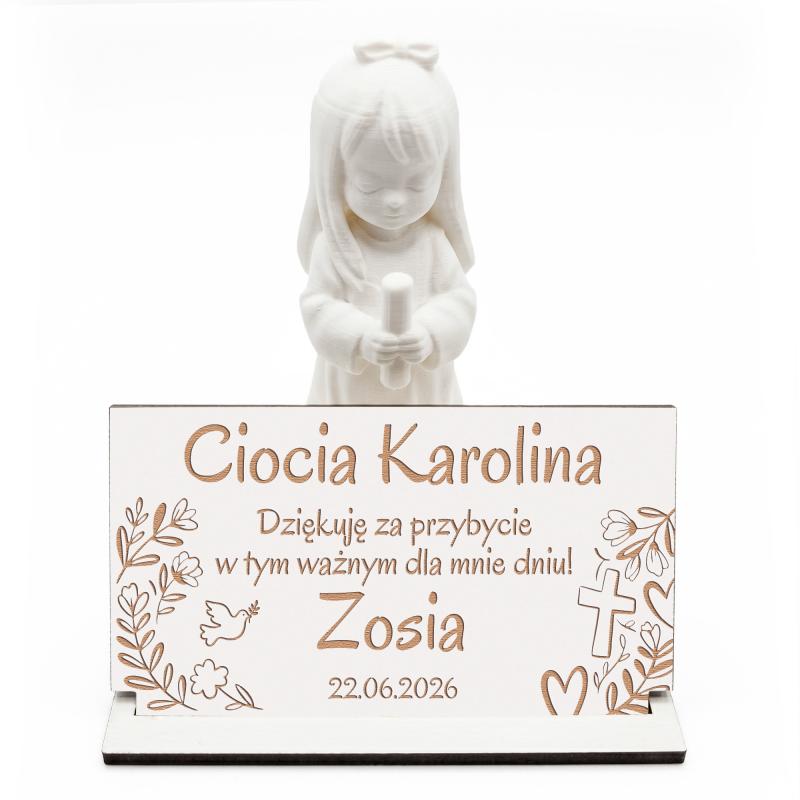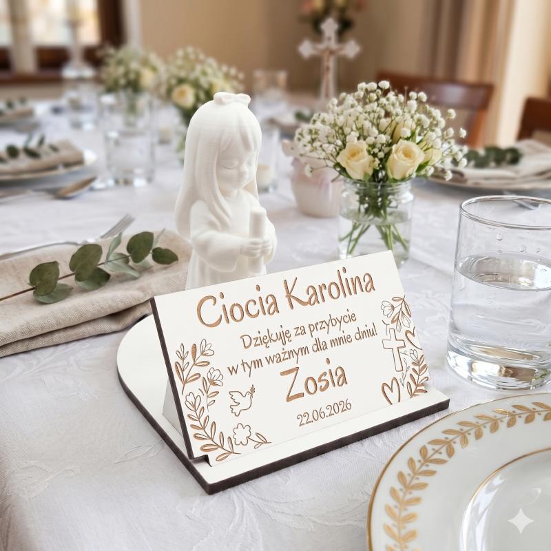 Elegancka winietka z dziewczynką to wyjątkowe podziękowanie dla gości na Pierwszą Komunię Świętą. Personalizowany grawer z imieniem gościa oraz dedykacją nadaje jej indywidualny i uroczysty charakter.