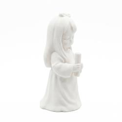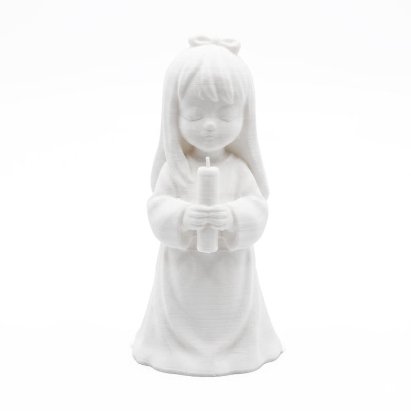 Subtelna figurka dziewczynki w komunijnym stroju z świecą pięknie podkreśla religijny charakter uroczystości i stanowi spójną dekorację stołu.