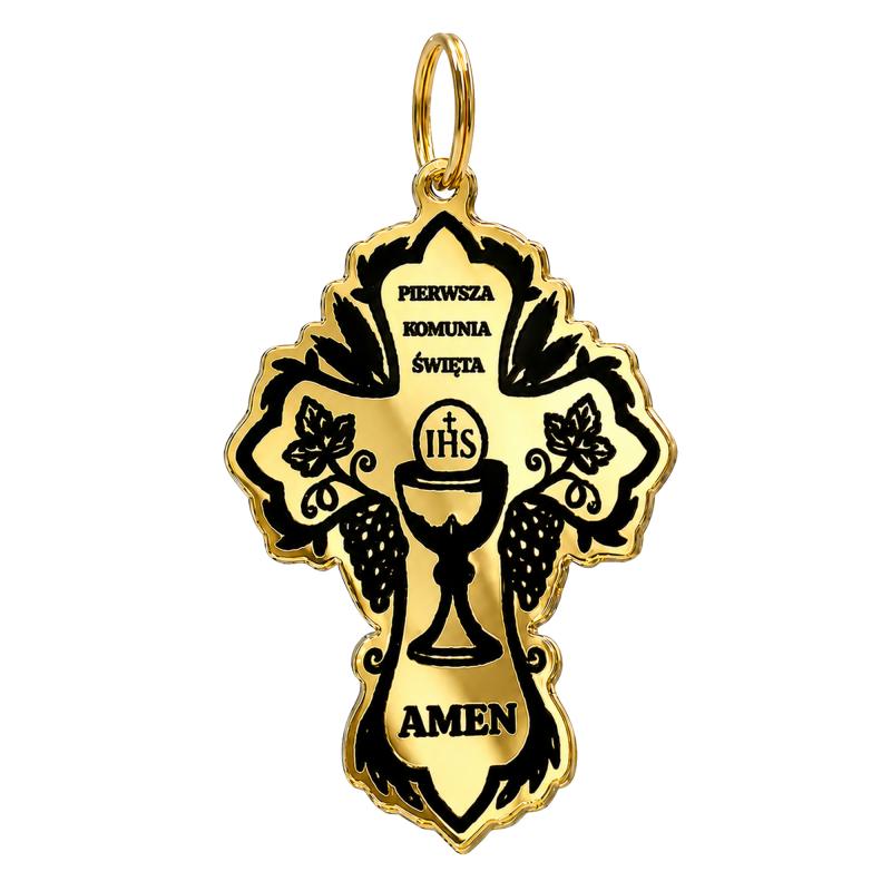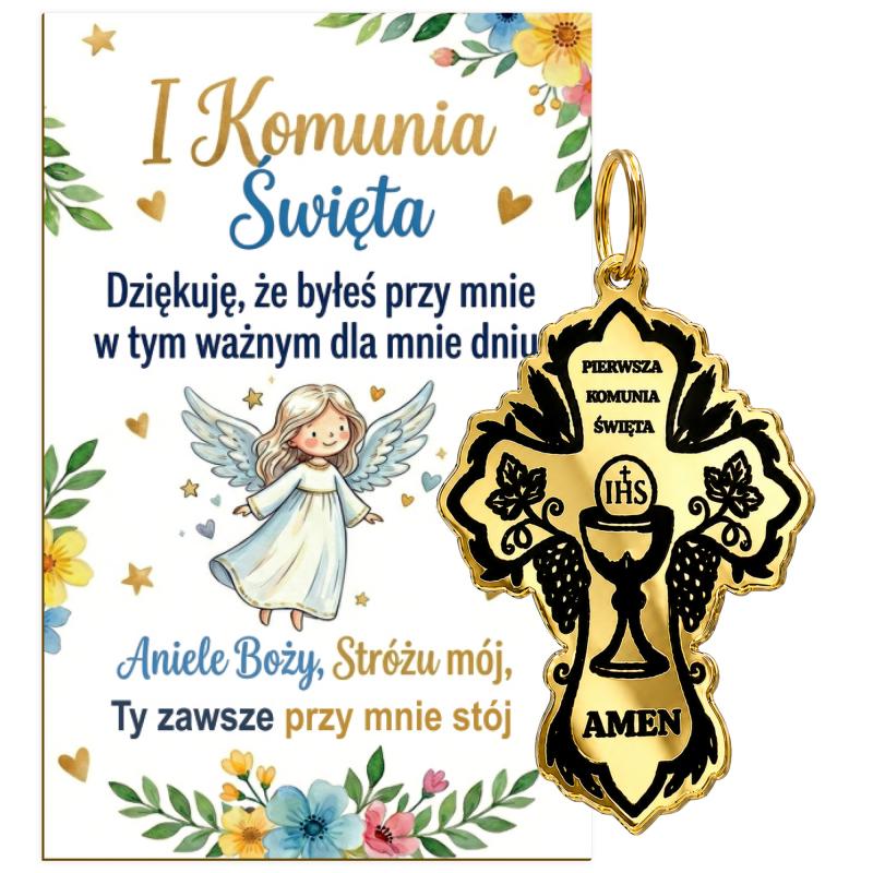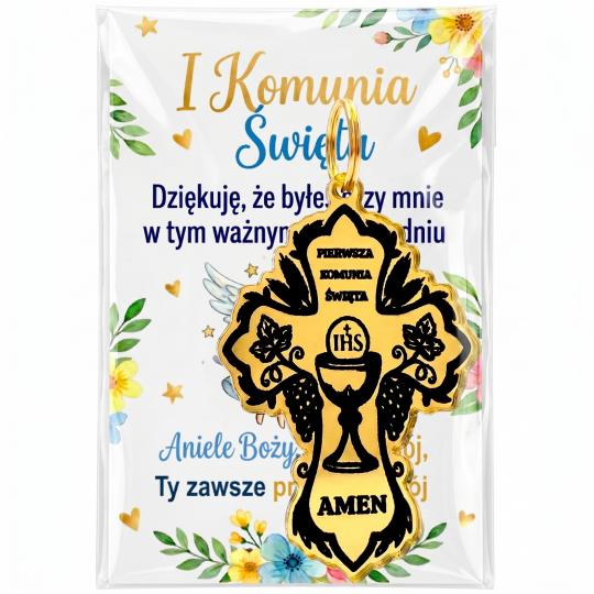 Złoty brelok komunijny w kształcie krzyża z dołączonym bilecikiem to elegancka i symboliczna forma podziękowania dla gości za obecność w tym wyjątkowym dniu.