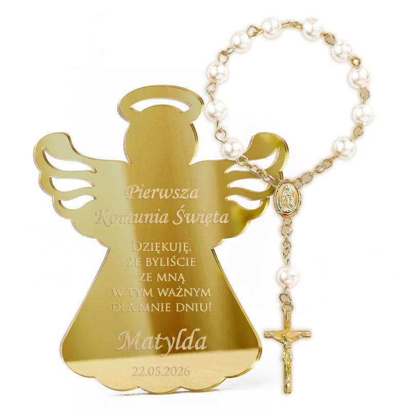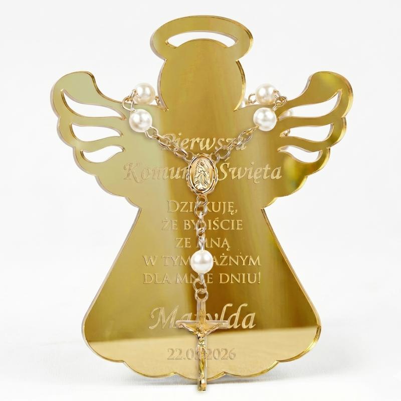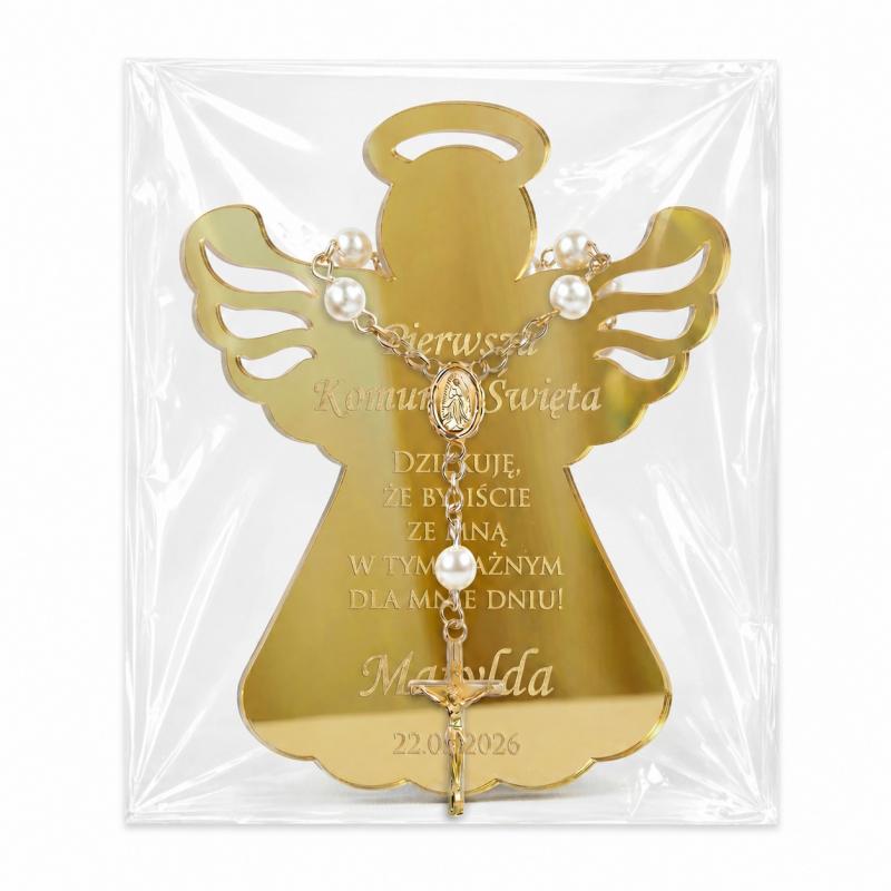 Zestaw Komunia Święta magnes aniołek złote lustro różaniec podziękowanie dla gości personalizowany prezent