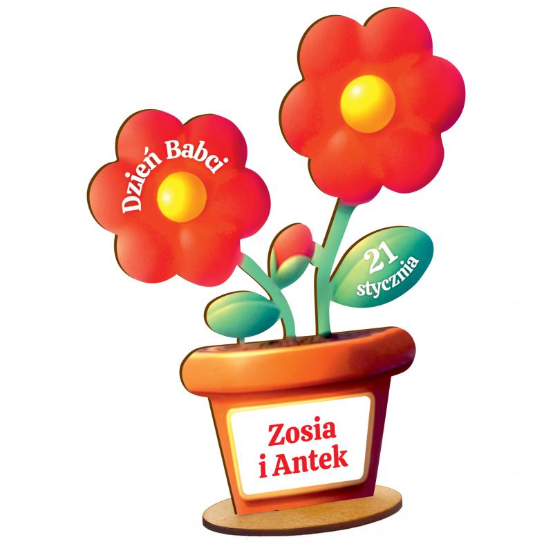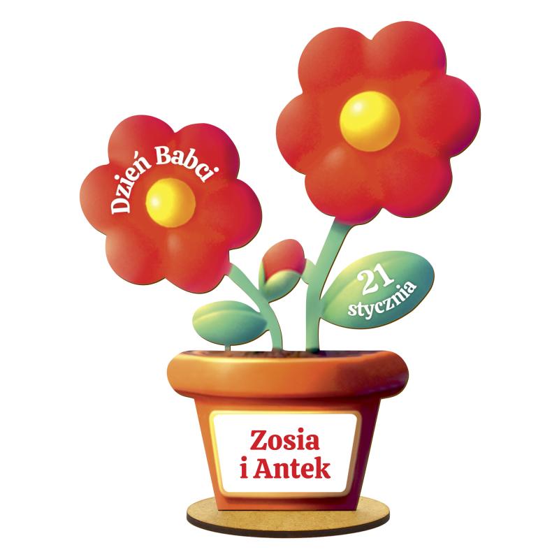 Personalizowany kwiatek na Dzień Babci to piękna, kolorowa dekoracja z imionami wnuków, idealna jako prezent na 21 stycznia. Wyjątkowy motyw kwiatów w doniczce, możliwość dodania imion oraz efektowny wygląd sprawiają, że to doskonały upominek dla Babci.