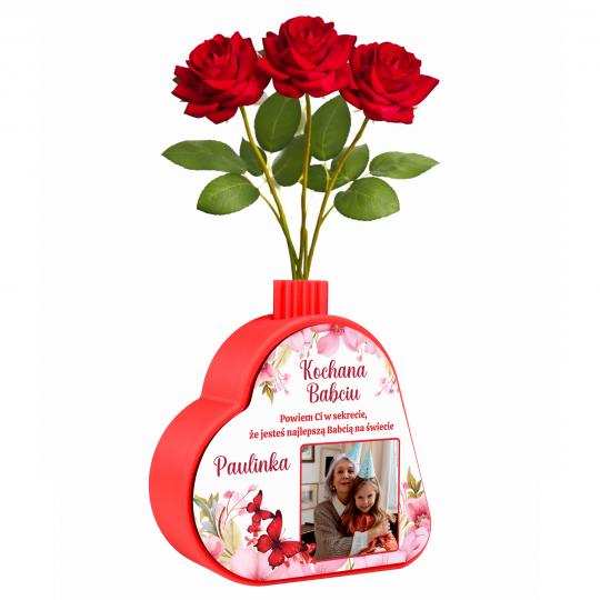 Uroczy wazon w kształcie serca to wyjątkowy i pełen ciepła prezent dla Kochanej Babci. Delikatne, kwiatowe motywy oraz subtelne motylki tworzą elegancką kompozycję, która pięknie podkreśla rodzinny charakter upominku. Zdjęcie wnuczki lub wnuka nadaje całości osobisty, wzruszający wymiar, czyniąc z wazonu pamiątkę na długie lata.