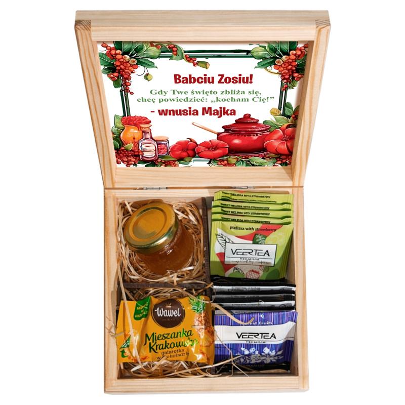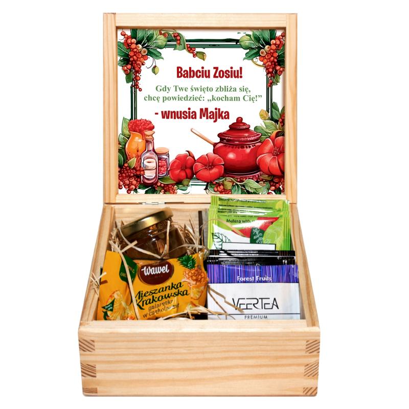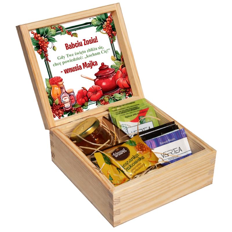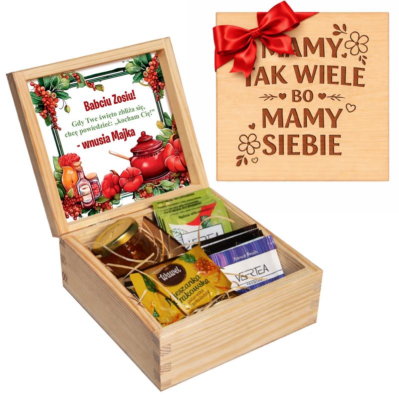Drewniana herbaciarka dla babci dziadka dedykacja prezent zestaw