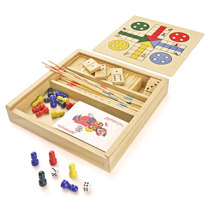 W komplecie znajdują się cztery klasyczne gry: domino, bierki, planszowa gra Chińczyk oraz talia kart. Zestaw doskonale sprawdzi się podczas rodzinnych popołudni, świąt czy wizyt wnuków, oferując różnorodne formy rozrywki dopasowane do każdego wieku.