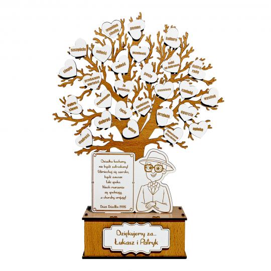 Drzewko umieszczone jest na stabilnej podstawie w formie pudełka, które pełni wyłącznie funkcję konstrukcyjną i dekoracyjną. W zestawie znajdują się tabliczki z dedykacją oraz postać Dziadka, nadające całości osobisty i ciepły charakter. To prezent, który w prosty, ale bardzo wymowny sposób pozwala wyrazić wdzięczność i uznanie.