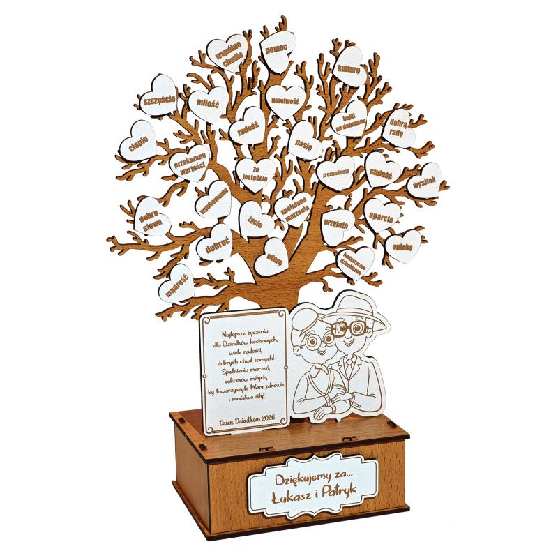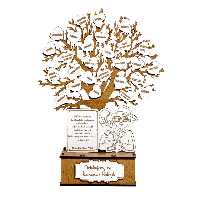 Drzewko umieszczone jest na stabilnej podstawie w formie pudełka, które pełni wyłącznie funkcję konstrukcyjną i dekoracyjną. W zestawie znajdują się tabliczki z dedykacją oraz postać Dziadka, nadające całości osobisty i ciepły charakter. To prezent, który w prosty, ale bardzo wymowny sposób pozwala wyrazić wdzięczność i uznanie.