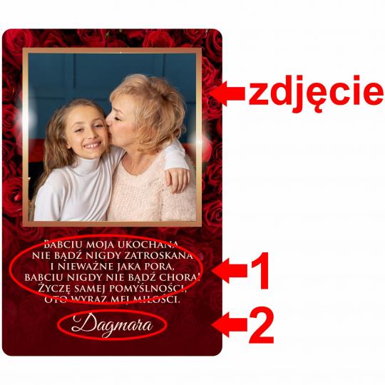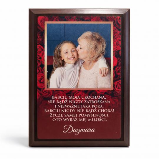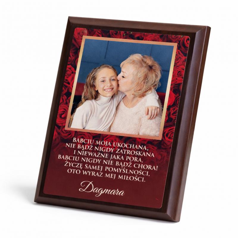 Personalizowany grawerton ze zdjęciem to wyjątkowy prezent dla Babci. Klasyczny wzór z motywem czerwonych róż podklejony do drewnainego podkładu o grubości 2cm sprawiają, że całość prezentuje się bardzo efektownie i wzruszająco. Z tyłu znjduje się otwór do zawieszenia.
