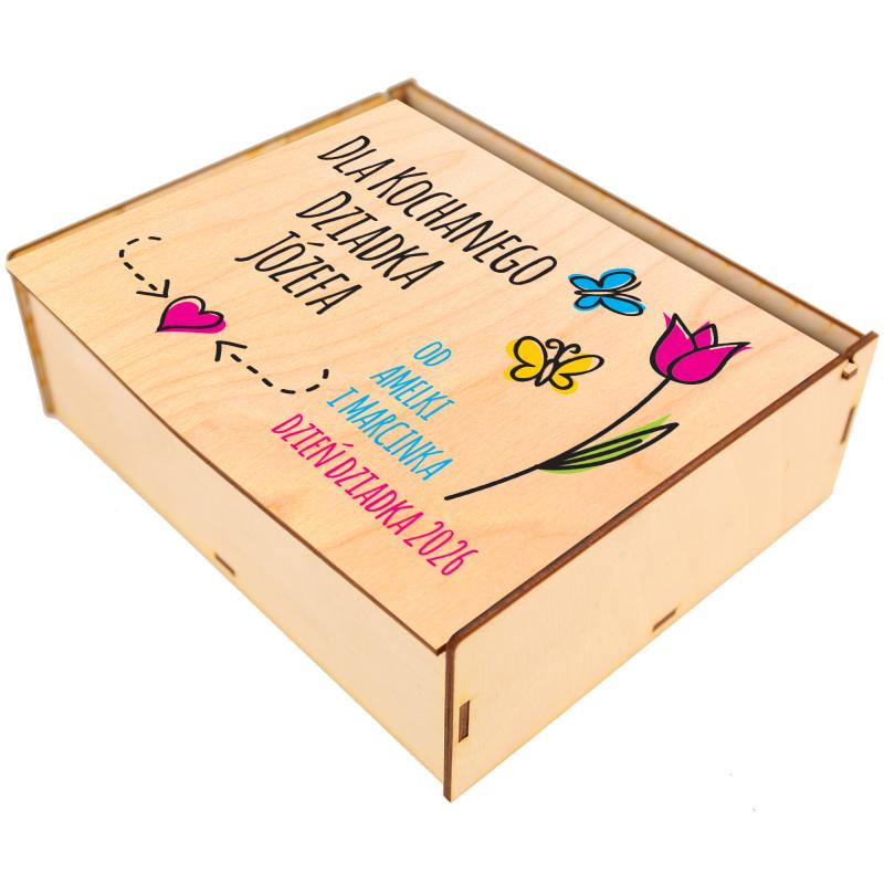Herbaciarka skrzynka prezentowa to elegancki, personalizowany upominek idealny na Dzień Babci i Dziadka lub jako prezent wręczany osobno. Drewniane pudełko z dowolnym tekstem i imieniem nadaje całości wyjątkowy, rodzinny charakter, tworząc piękną pamiątkę na lata.