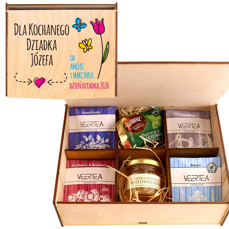 Personalizowana herbaciarka prezent skrzyneczka na Dzień Babci Dziadka z herbatą i miodem