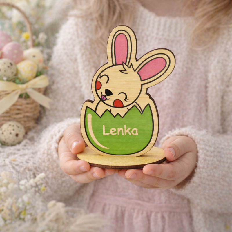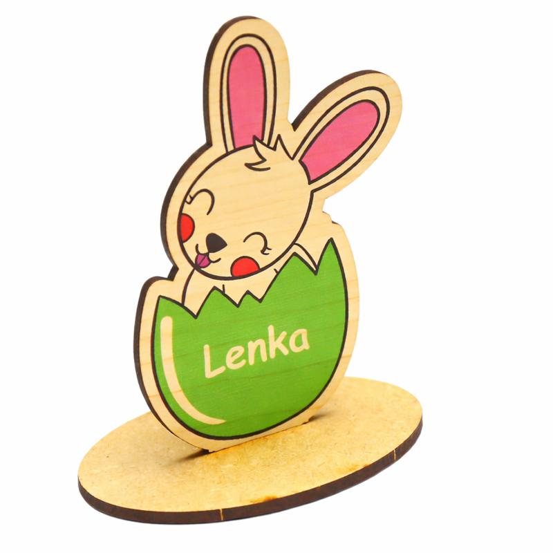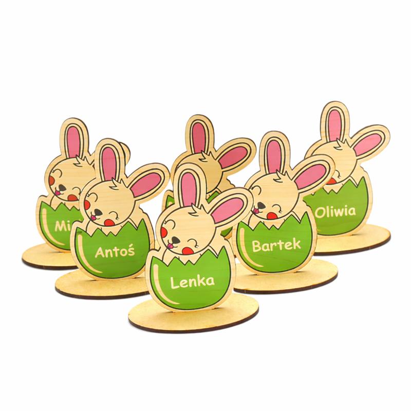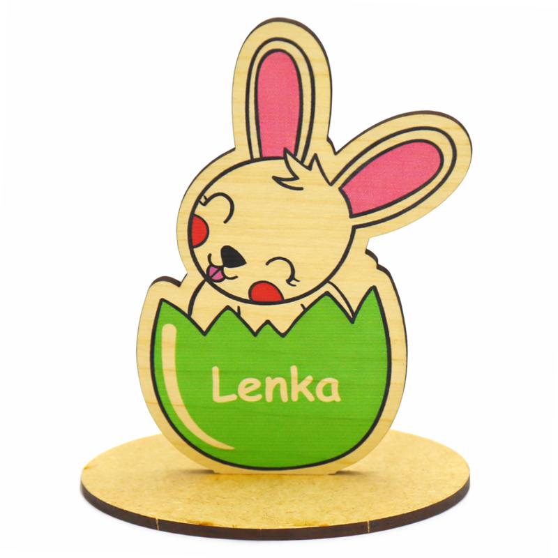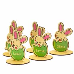 Urocza dekoracja wielkanocna w formie zajączka ukrytego w skorupce pisanki z imieniem to wyjątkowy akcent na świąteczny stół.