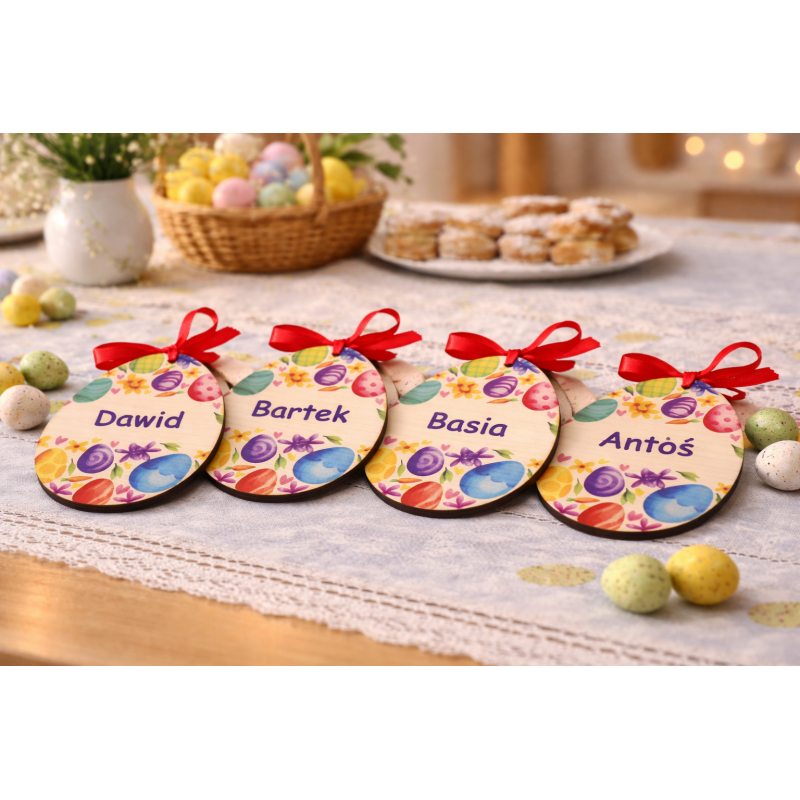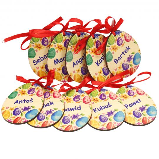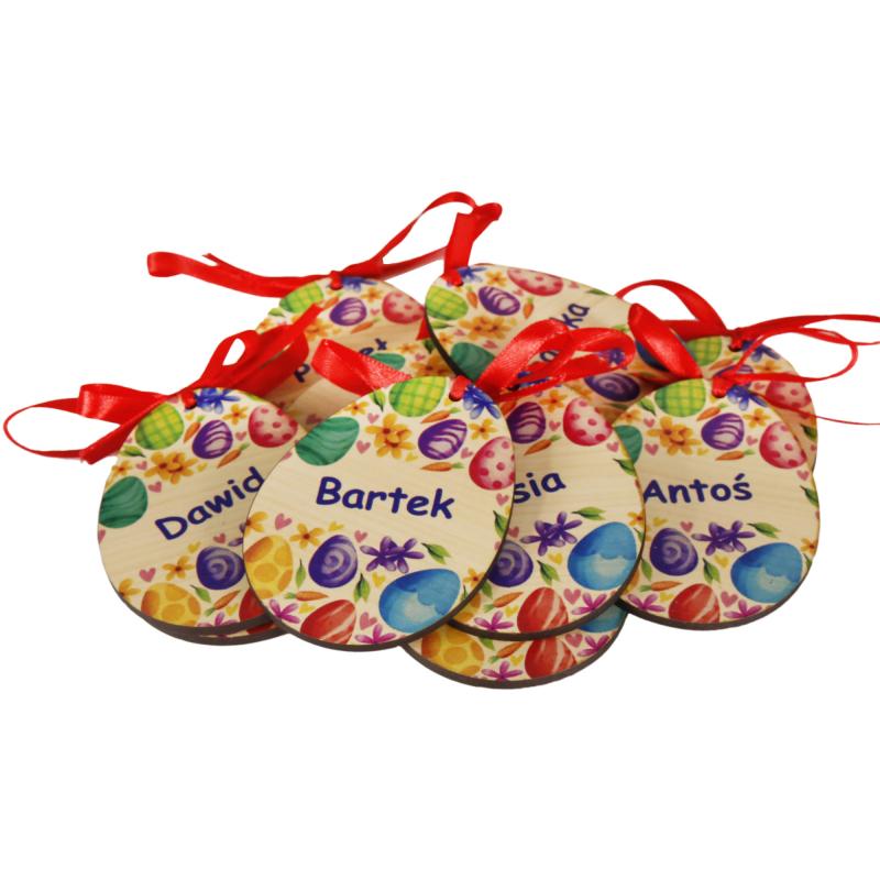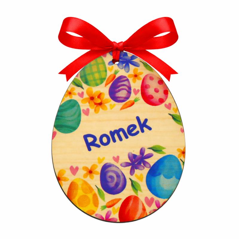 Dekoracyjne jajko wielkanocne wykonane z drewna MDF, ozdobione wyrazistym, kolorowym nadrukiem oraz imieniem w formie pisanki.