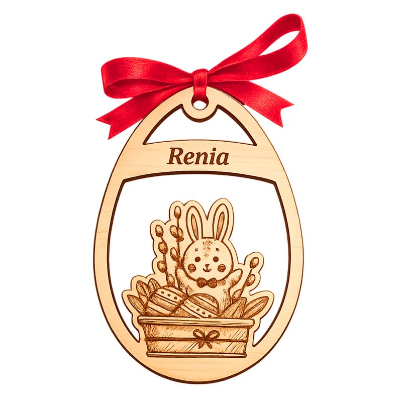 Delikatny motyw zajączka w koszyku oraz precyzyjny grawer nadają całości elegancki i świąteczny charakter.