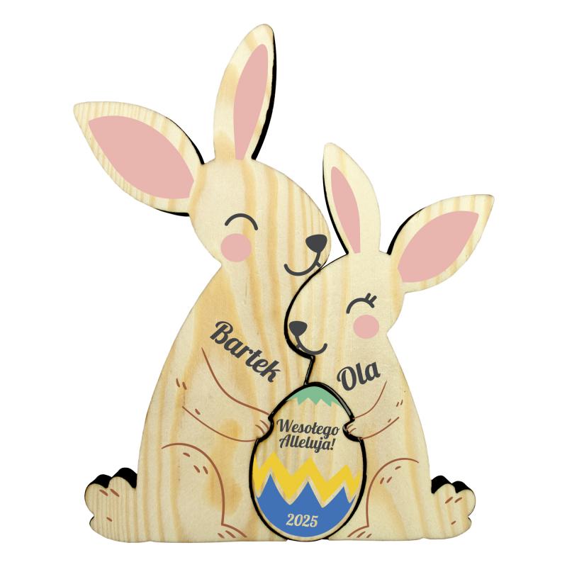 Szukasz wyjątkowej ozdoby na Wielkanoc, która doda uroku Twoim wnętrzom? Nasze drewniane zające z imionami to niepowtarzalna i personalizowana dekoracja wielkanocna, która zachwyci każdego! Uroczy duet zajączków trzymających pisankę to symbol radości, bliskości i świątecznej atmosfery.