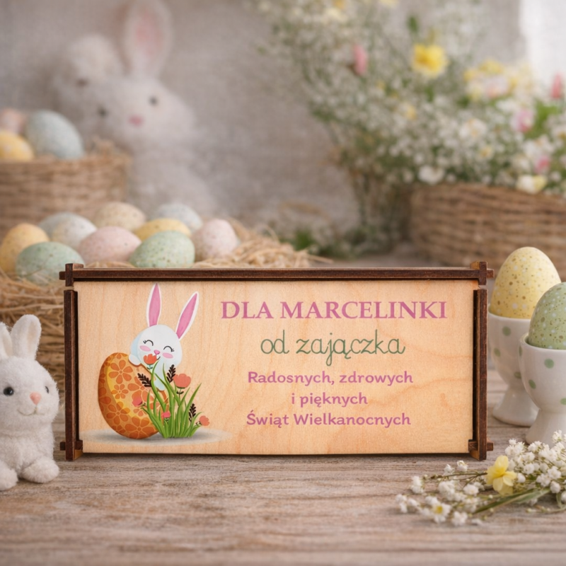 Drewniane pudełko na czekoladę prezent Wielkanoc personalizowany