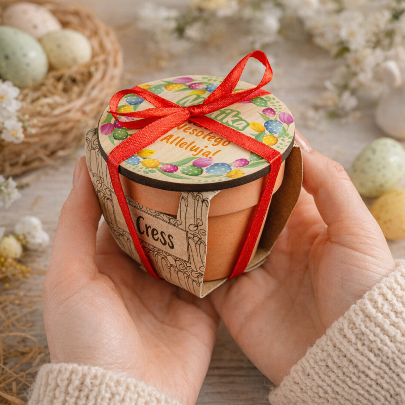 Rzeżucha w doniczce z podstawką i personalizacją Wielkanoc