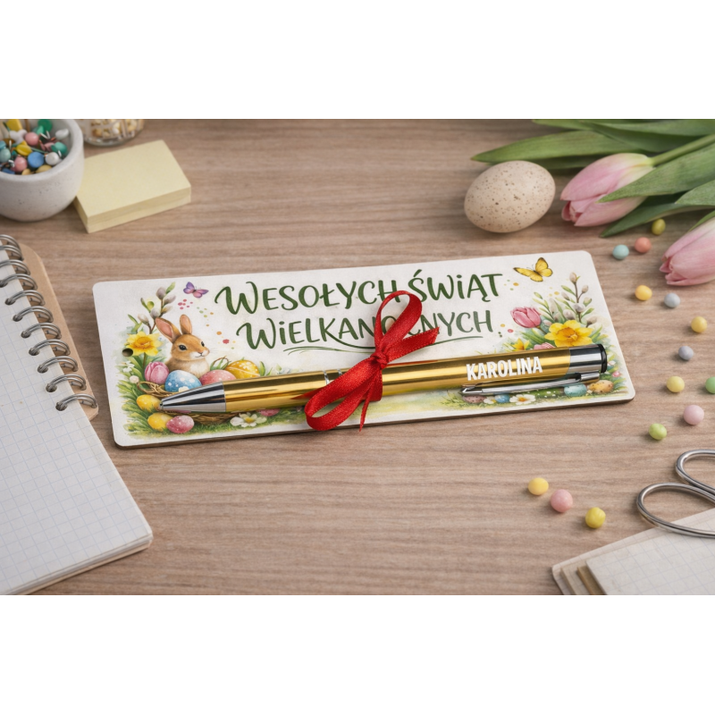 Personalizowany zestaw wielkanocny składający się z zakładki do książki oraz długopisu z grawerowanym imieniem to praktyczny i elegancki upominek na Wielkanoc.