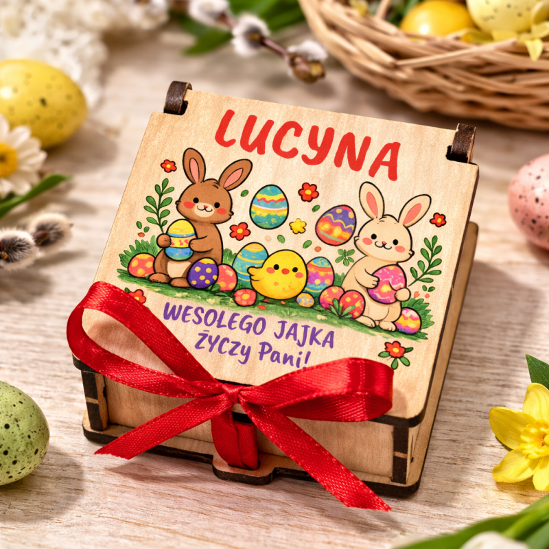 Na pudełeczku znajduje się imię dziecka oraz kolorowa wielkanocna grafika z zajączkiem, kurczaczkiem i pisankami, dzięki czemu upominek jest wyjątkowy i przygotowany specjalnie dla obdarowanej osoby.